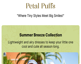 Petal Puffs offers adorable and stylish clothes for kids, designed with comfort, color, and care in mind. From playful everyday wear to charming dresses, we make every outfit as joyful as childhood itself.